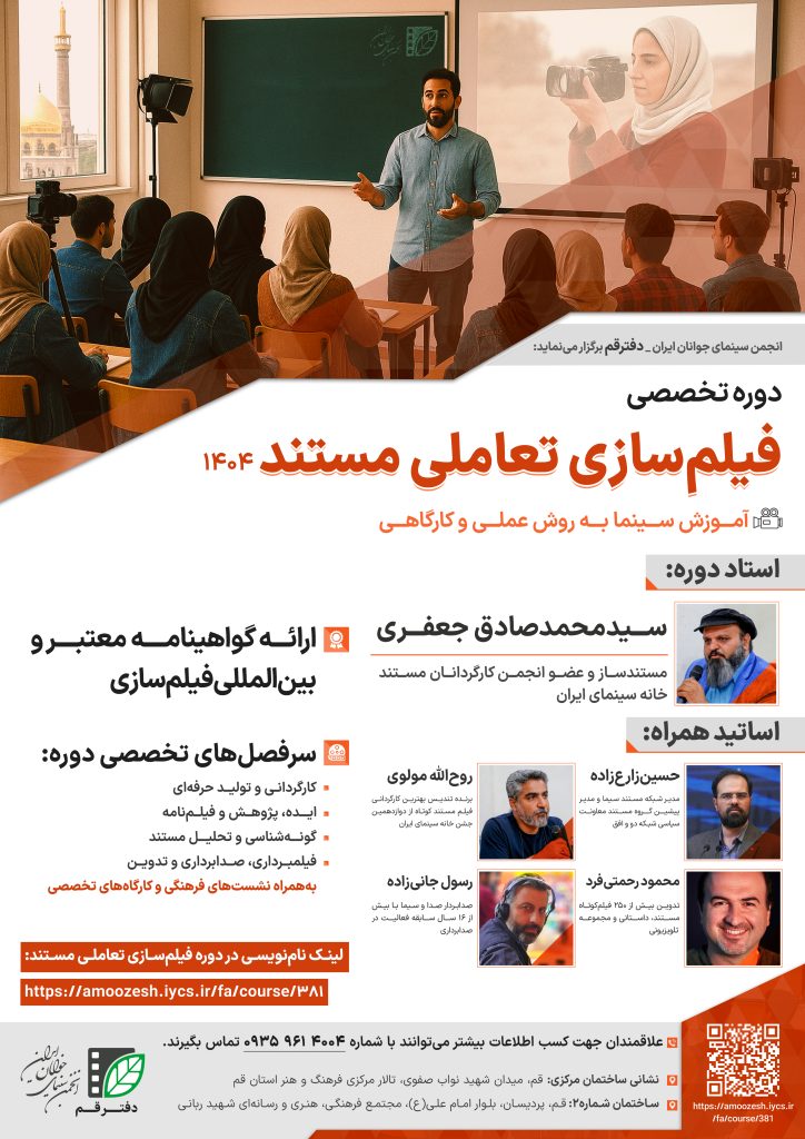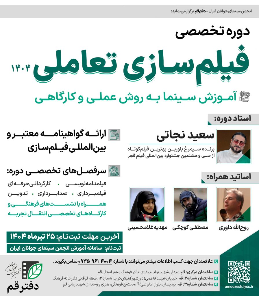 دوره جامع فیلمسازی داستانی که با هدف شناسایی، جذب، حمایت و پرورش استعدادهای علاقهمند به هنر سینما و فعالیتهای فیلمسازی در استان قم برگزار میگردد، با برگزاری آزمون ورودی در روز جمعه مورخ 16 آبانماه 1404 پذیرای هنرجویان جدید خواهد بود.